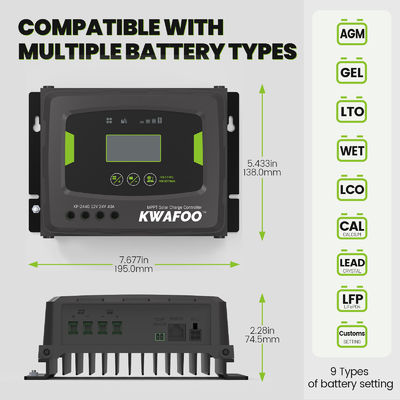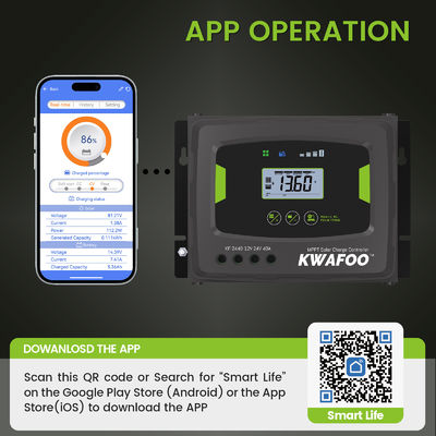 KWAFOO 40Amp MPPT 태양 제어기는 벽에 장착된 디자인으로 쉽게 설치하고 공간을 절약 할 수 있습니다.제어기는 태양계를 보호하기 위해 포괄적인 보호 장치가 장착되어 있습니다., 과충전 보호, 단회로 보호 및 역극성 보호를 포함한다.